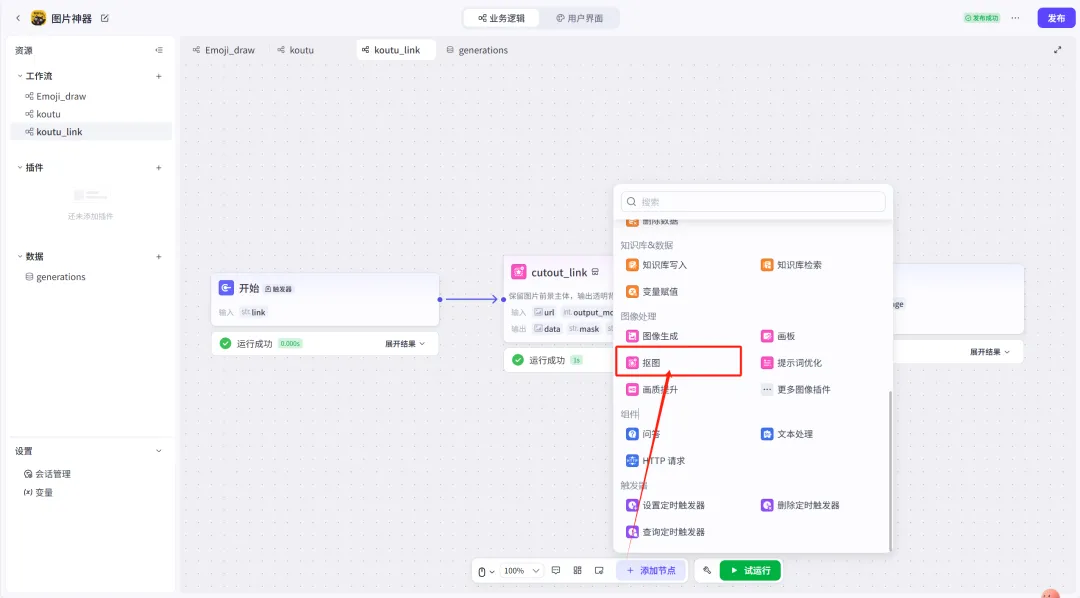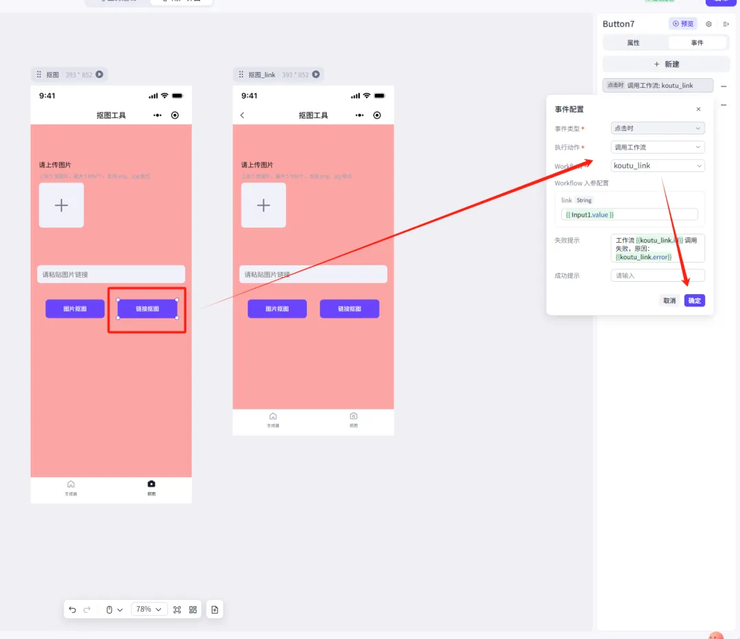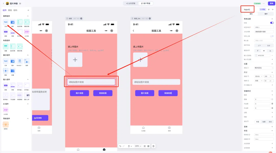 「链接抠图」原理同理,其中workflow入参配置就是「文字输入框」组件的参数名称input1,且为了保持美观,这里让链接抠图结果另起一页,让结果能直接呈现在下方: