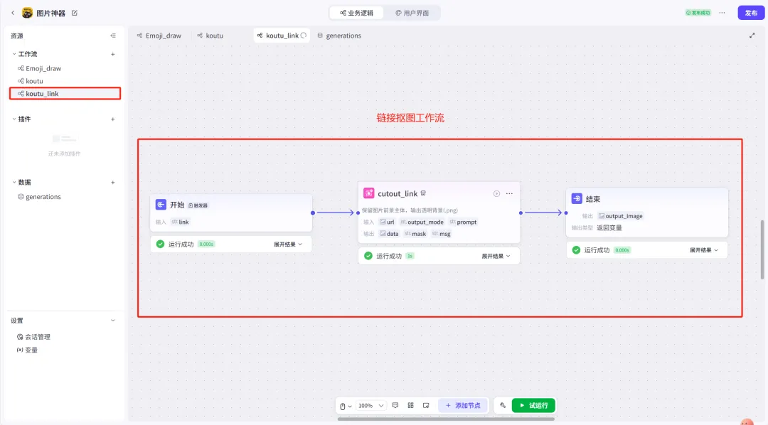 从输出结果看,可以判定这个AI智能体应用使用了「工作流」与「插件」功能,且只有一个核心功能:上传图片或粘贴图片链接,对图片进行主体抠图。