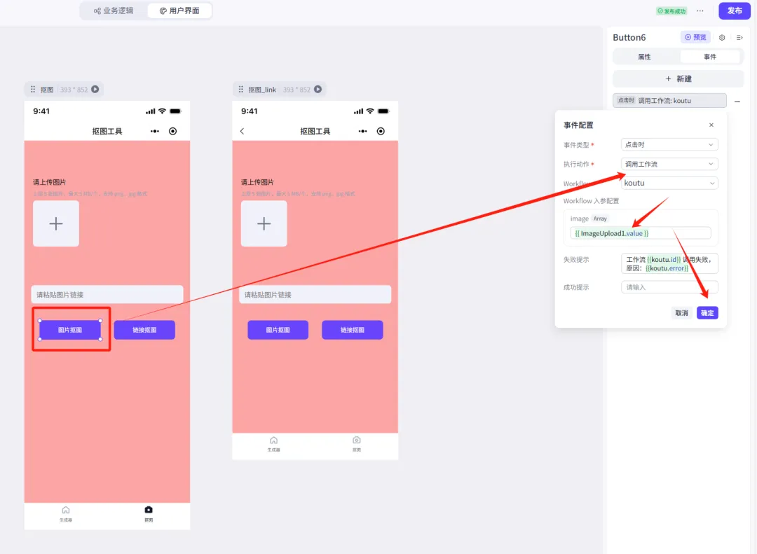 因此,需要依赖「按钮」组件的「事件」配置各个参数,调用工作流,其中workflow入参配置就是「上传图片」组件的参数名称: